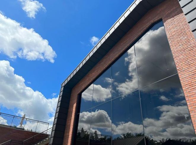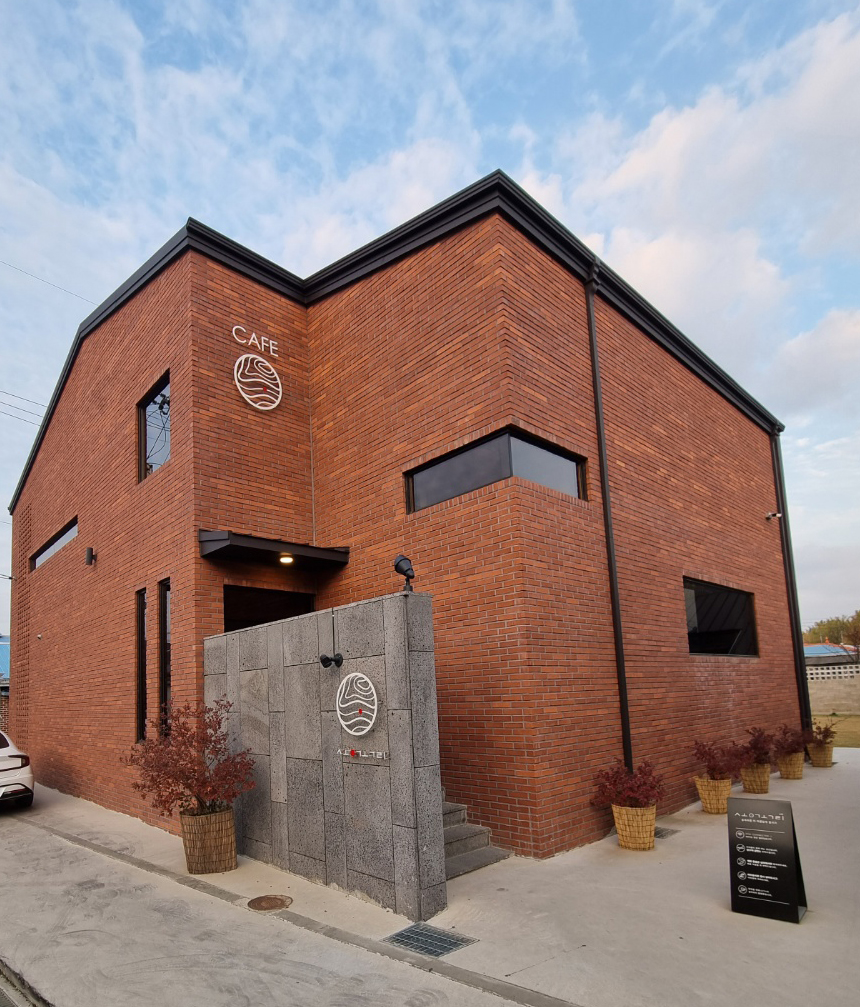 빨간 벽돌과 잔디가 있는 공간 높은 층고, 통유리창이 인상적입니다.