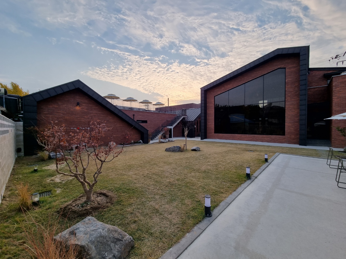 빨간 벽돌과 잔디가 있는 공간 높은 층고, 통유리창이 인상적입니다.